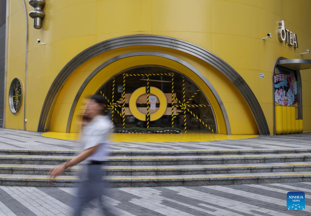 Adhesive strips are seen on windows of a shopping mall in Shenzhen, south China's Guangdong Province, Sept. 23, 2025. South China's Guangdong Province raised its wind emergency response to the highest level at 10 a.m. Tuesday, as Typhoon Ragasa is forecast to make landfall along the central or western coastal areas of the province as a strong or super strong typhoon within 24 hours.