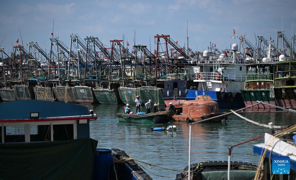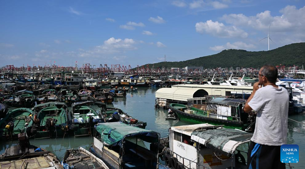 This photo taken on Sept. 23, 2025 shows fishing boats berthing at a fishing port on the Hailing Island in Yangjiang City, south China's Guangdong Province. South China's Guangdong Province raised its wind emergency response to the highest level at 10 a.m. Tuesday, as Typhoon Ragasa is forecast to make landfall along the central or western coastal areas of the province as a strong or super strong typhoon within 24 hours.