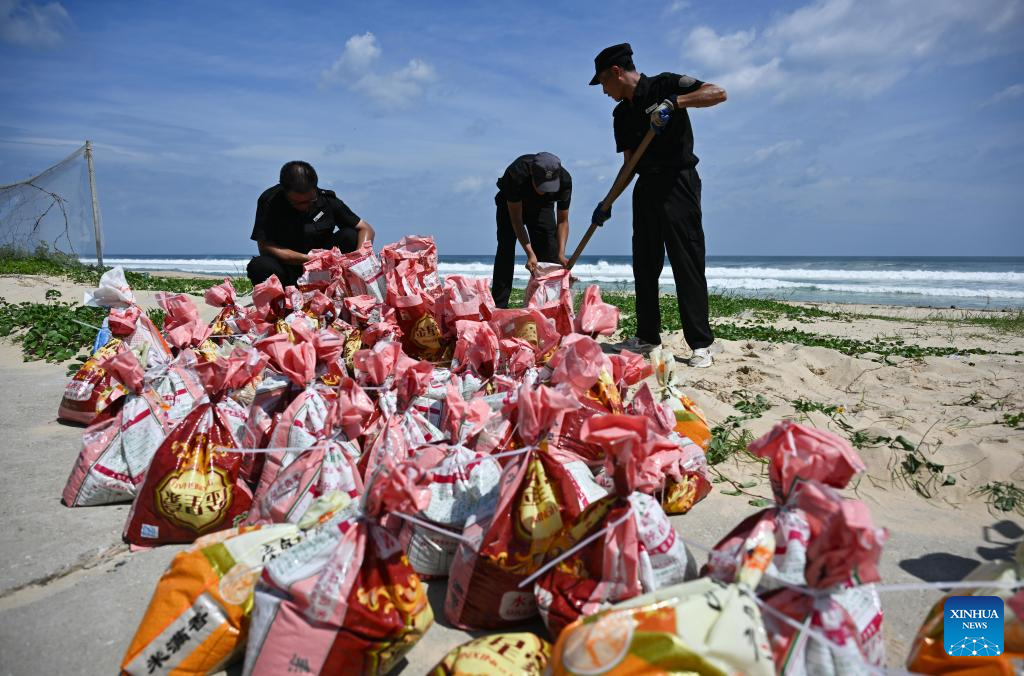Staff members of a hotel prepare sandbags on the Hailing Island in Yangjiang City, south China's Guangdong Province, Sept. 23, 2025. South China's Guangdong Province raised its wind emergency response to the highest level at 10 a.m. Tuesday, as Typhoon Ragasa is forecast to make landfall along the central or western coastal areas of the province as a strong or super strong typhoon within 24 hours.