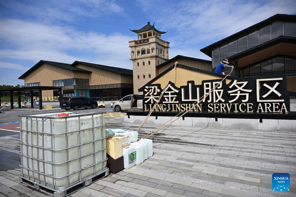 (250923) -- JIANGMEN, Sept. 23, 2025 (Xinhua) -- A staff member reinforce installations at a service area of an expressway in Jiangmen City, south China's Guangdong Province, Sept. 23, 2025. South China's Guangdong Province raised its wind emergency response to the highest level at 10 a.m. Tuesday, as Typhoon Ragasa is forecast to make landfall along the central or western coastal areas of the province as a strong or super strong typhoon within 24 hours.