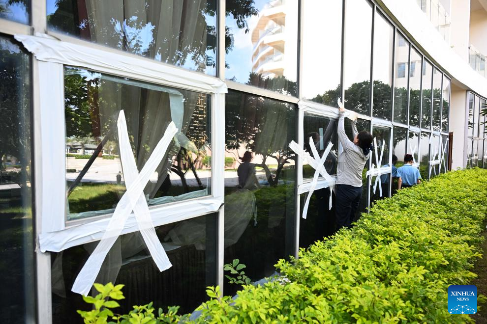 A staff member sticks adhesive strips on windows of a hotel on Hailing Island in Yangjiang City, south China's Guangdong Province, Sept. 23, 2025. South China's Guangdong Province raised its wind emergency response to the highest level at 10 a.m. Tuesday, as Typhoon Ragasa is forecast to make landfall along the central or western coastal areas of the province as a strong or super strong typhoon within 24 hours.