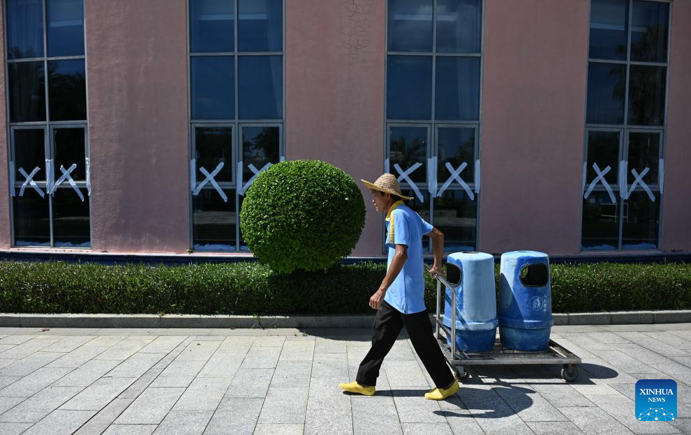 A staff member of a hotel transfers trash bins on the seaside of the Hailing Island in Yangjiang City, south China's Guangdong Province, Sept. 23, 2025. South China's Guangdong Province raised its wind emergency response to the highest level at 10 a.m. Tuesday, as Typhoon Ragasa is forecast to make landfall along the central or western coastal areas of the province as a strong or super strong typhoon within 24 hours.