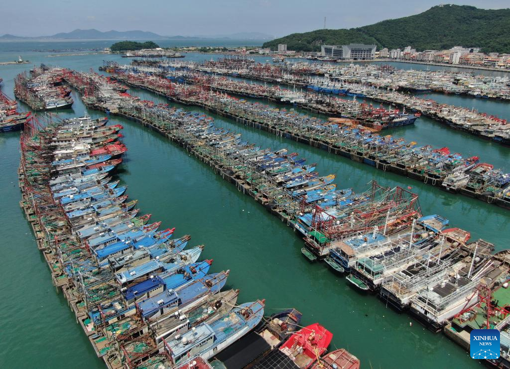 An aerial drone photo taken on Sept. 23, 2025 shows fishing boats berthing at a fishing port on the Hailing Island in Yangjiang City, south China's Guangdong Province. South China's Guangdong Province raised its wind emergency response to the highest level at 10 a.m. Tuesday, as Typhoon Ragasa is forecast to make landfall along the central or western coastal areas of the province as a strong or super strong typhoon within 24 hours.