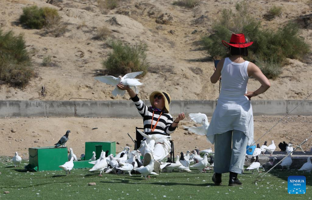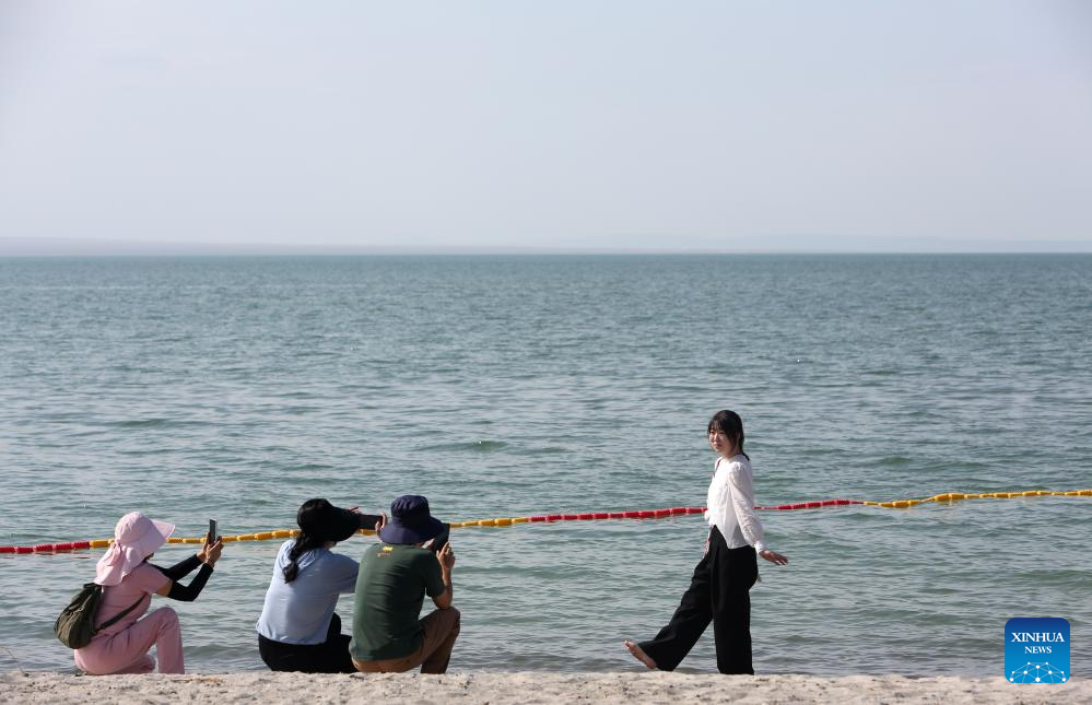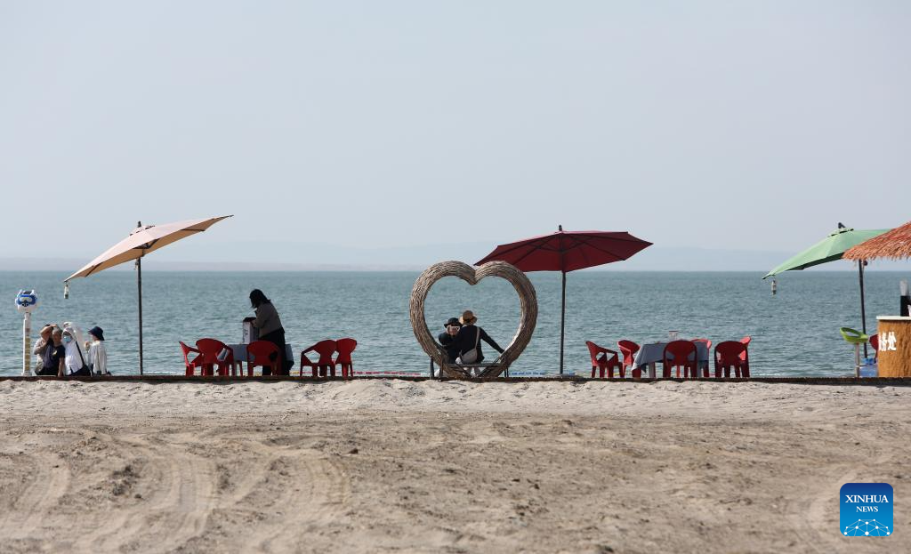 Tourists enjoy leisure time on the beach by the Ulunggur Lake in Fuhai County of Altay, northwest China's Xinjiang Uygur Autonomous Region, Sept. 8, 2025.