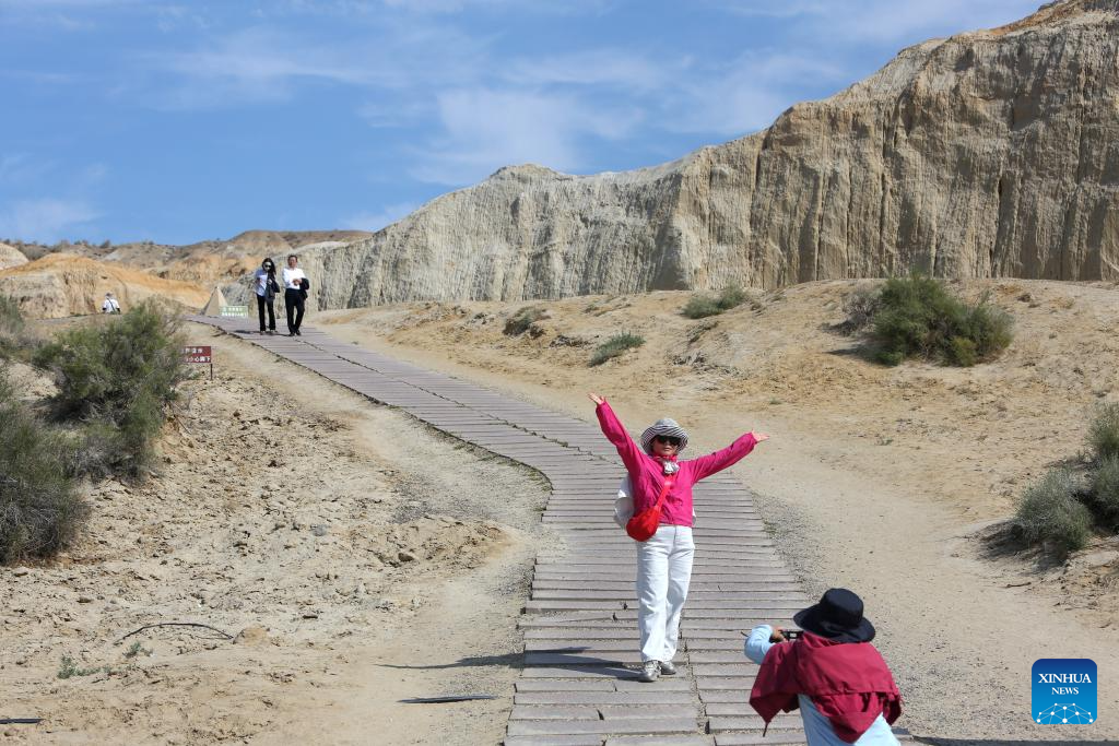 A tourist poses for photos at a scenic spot of Ulunggur Lake in Fuhai County of Altay, northwest China's Xinjiang Uygur Autonomous Region, Sept. 8, 2025.