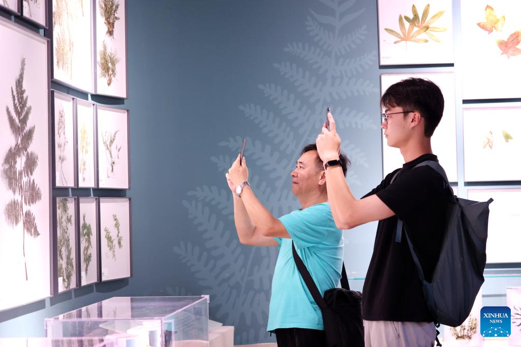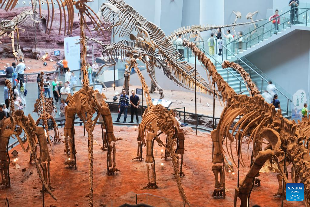 People take pictures of exhibits displayed at Zhejiang Museum of Natural History in Hangzhou, east China's Zhejiang Province, Oct. 4, 2025. Tourist destinations across China are witnessing a surge in visitors as the country's eight-day National Day and Mid-Autumn Festival holiday began on Wednesday. (Photo by Zhou Fangling/Xinhua)