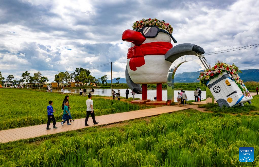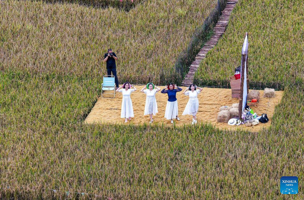 People pose for pictures among paddy fields in Qujing City, southwest China's Yunnan Province, Oct. 4, 2025. Tourist destinations across China are witnessing a surge in visitors as the country's eight-day National Day and Mid-Autumn Festival holiday began on Wednesday. (Photo by Sun Wenlai/Xinhua)
