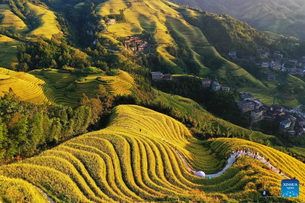 An aerial drone photo taken on Oct. 4, 2025 shows people visiting Longji terrace in Longsheng County of Guilin City, south China's Guangxi Zhuang Autonomous Region. Tourist destinations across China are witnessing a surge in visitors as the country's eight-day National Day and Mid-Autumn Festival holiday began on Wednesday. (Photo by Liu Zhenjun/Xinhua)