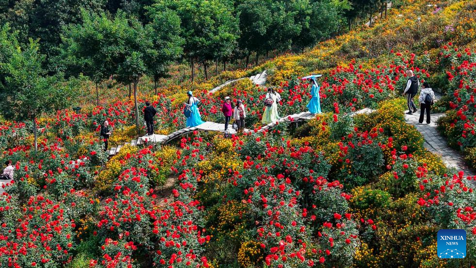 A drone photo taken on Oct. 4, 2025 shows tourists at a scenic spot in Xinglong County of Chengde City, north China's Hebei Province. Tourist destinations across China are witnessing a surge in visitors as the country's eight-day National Day and Mid-Autumn Festival holiday began on Wednesday. (Photo by Liu Mancang/Xinhua)