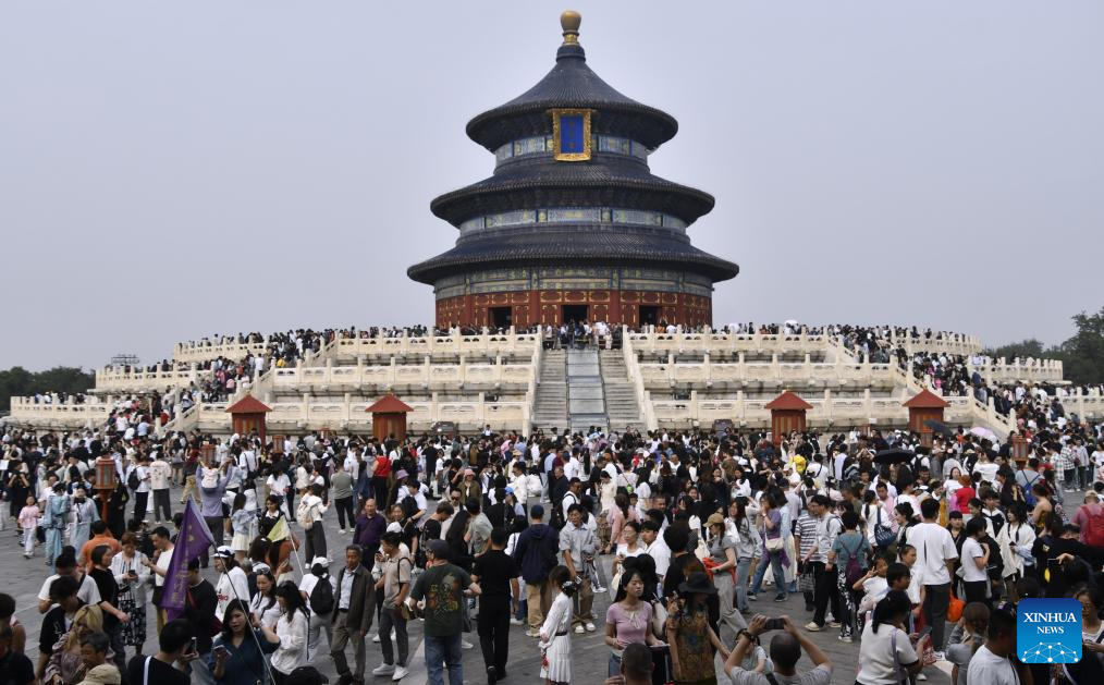 People visit the Temple of Heaven in Beijing, capital of China, Oct. 4, 2025. Tourist destinations across China are witnessing a surge in visitors as the country's eight-day National Day and Mid-Autumn Festival holiday began on Wednesday. (Xinhua/Li Xin)