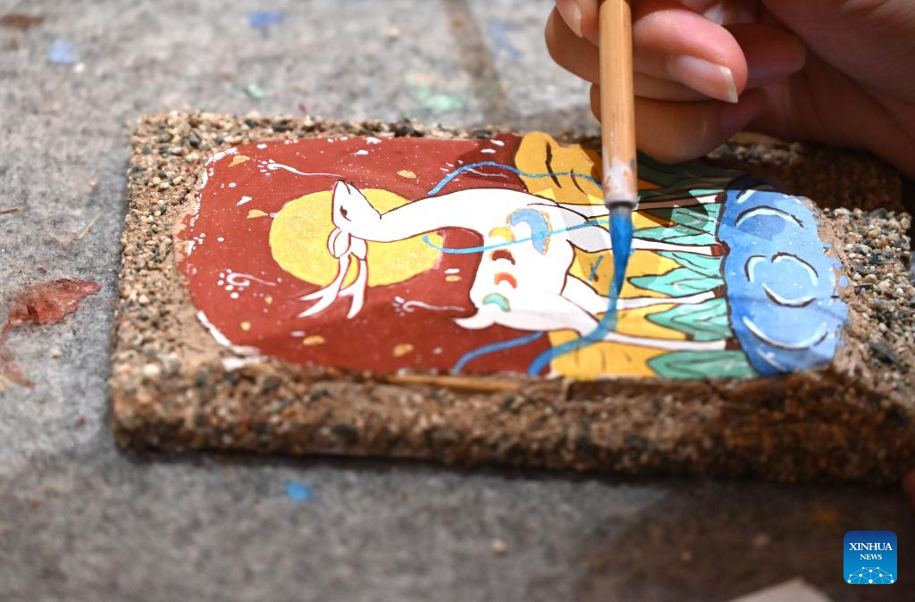 A tourist learns to draw mural patterns at a Dunhuang culture experience center in Dunhuang, northwest China's Gansu Province, Oct. 4, 2025. Tourist destinations across China are witnessing a surge in visitors as the country's eight-day National Day and Mid-Autumn Festival holiday began on Wednesday. (Photo by Zhang Xiaoliang/Xinhua)