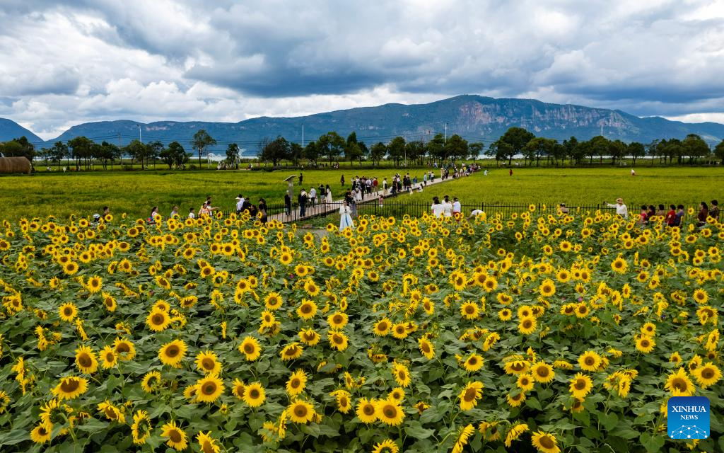 A drone photo taken on Oct. 4, 2025 shows tourists enjoying view of sunflowers near Dianchi Lake in Kunming, southwest China's Yunnan Province. Tourist destinations across China are witnessing a surge in visitors as the country's eight-day National Day and Mid-Autumn Festival holiday began on Wednesday. (Xinhua/Chen Xinbo)