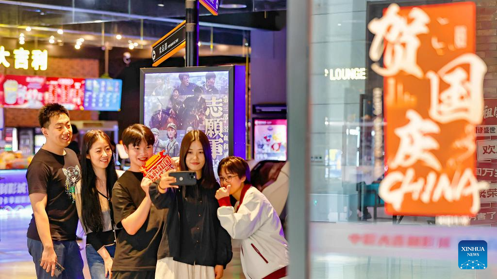 People take selfies with a movie poster at a cinema in north China's Tianjin, Oct. 4, 2025. Tourist destinations across China are witnessing a surge in visitors as the country's eight-day National Day and Mid-Autumn Festival holiday began on Wednesday. (Photo by Du Penghui/Xinhua)