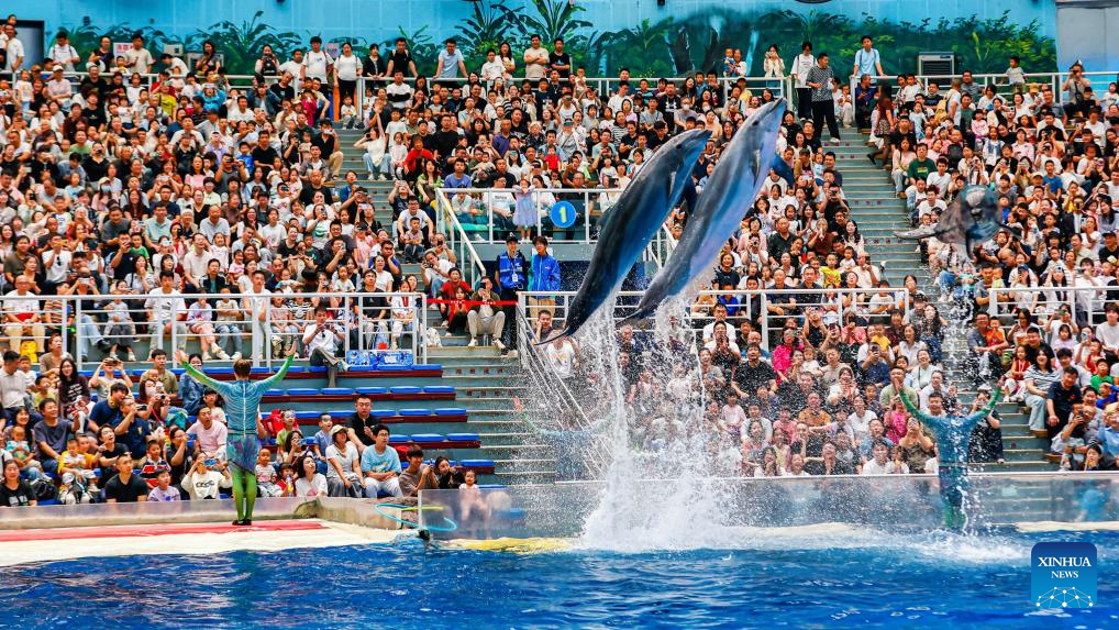 Tourists enjoy performance at an ocean park in north China's Tianjin, Oct. 4, 2025. Tourist destinations across China are witnessing a surge in visitors as the country's eight-day National Day and Mid-Autumn Festival holiday began on Wednesday. (Photo by Du Penghui/Xinhua)