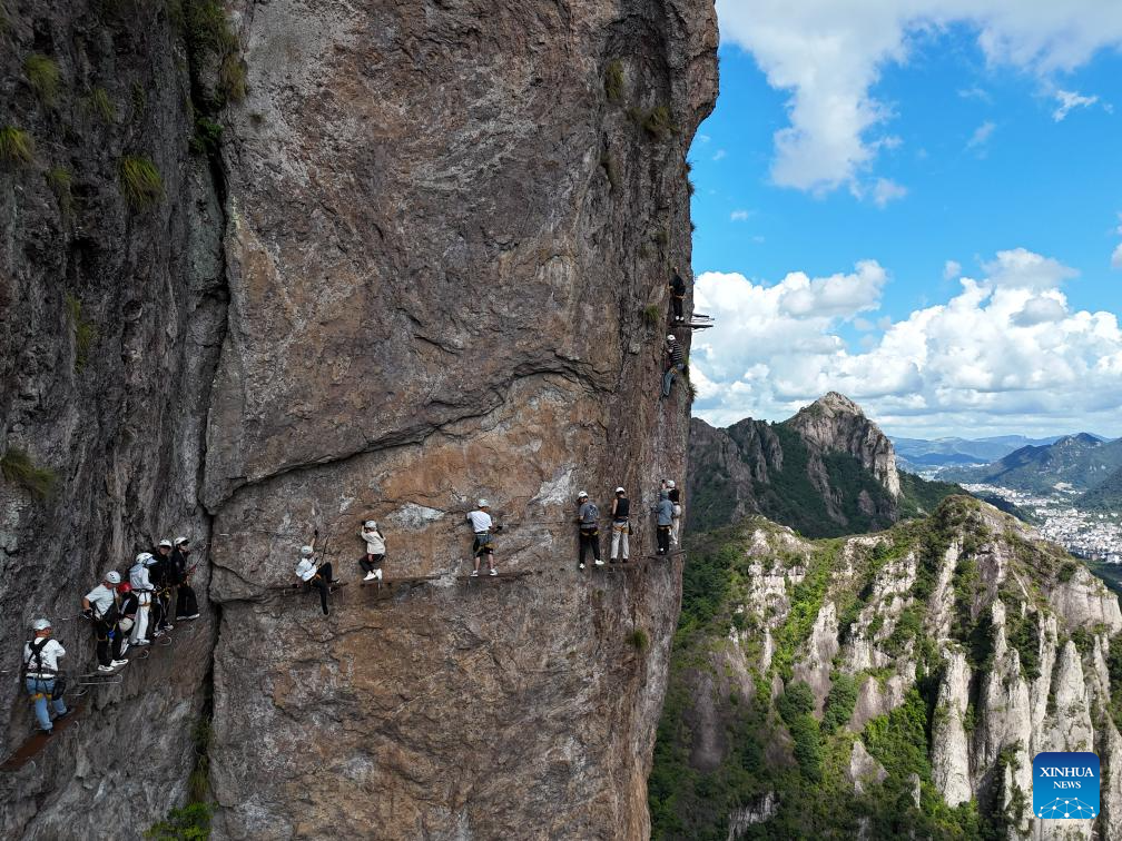A drone photo taken on Oct. 4, 2025 shows tourists experiencing Via Ferrata, a form of assisted climbing along steel cables and footholds anchored into cliff faces, at a scenic spot in Yueqing of east China's Zhejiang Province. Tourist destinations across China are witnessing a surge in visitors as the country's eight-day National Day and Mid-Autumn Festival holiday began on Wednesday. (Photo by Cai Kuanyuan/Xinhua)