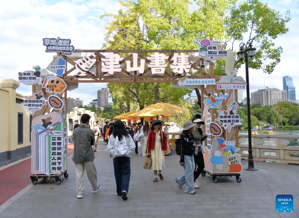 People visit a market at Cuihu Park in Kunming, southwest China's Yunnan Province, Oct. 3, 2025. Tourist destinations across China are witnessing a surge in visitors as the country's eight-day National Day and Mid-Autumn Festival holiday began on Wednesday. (Xinhua/Li Xiyan)