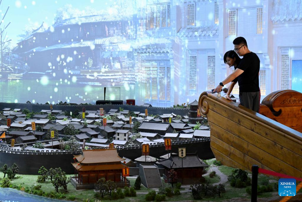 People visit an exhibition hall of a national cultural park featuring the Grand Canal in Huai'an, east China's Jiangsu Province, Oct. 4, 2025. Tourist destinations across China are witnessing a surge in visitors as the country's eight-day National Day and Mid-Autumn Festival holiday began on Wednesday. (Photo by Chen Qibao/Xinhua)