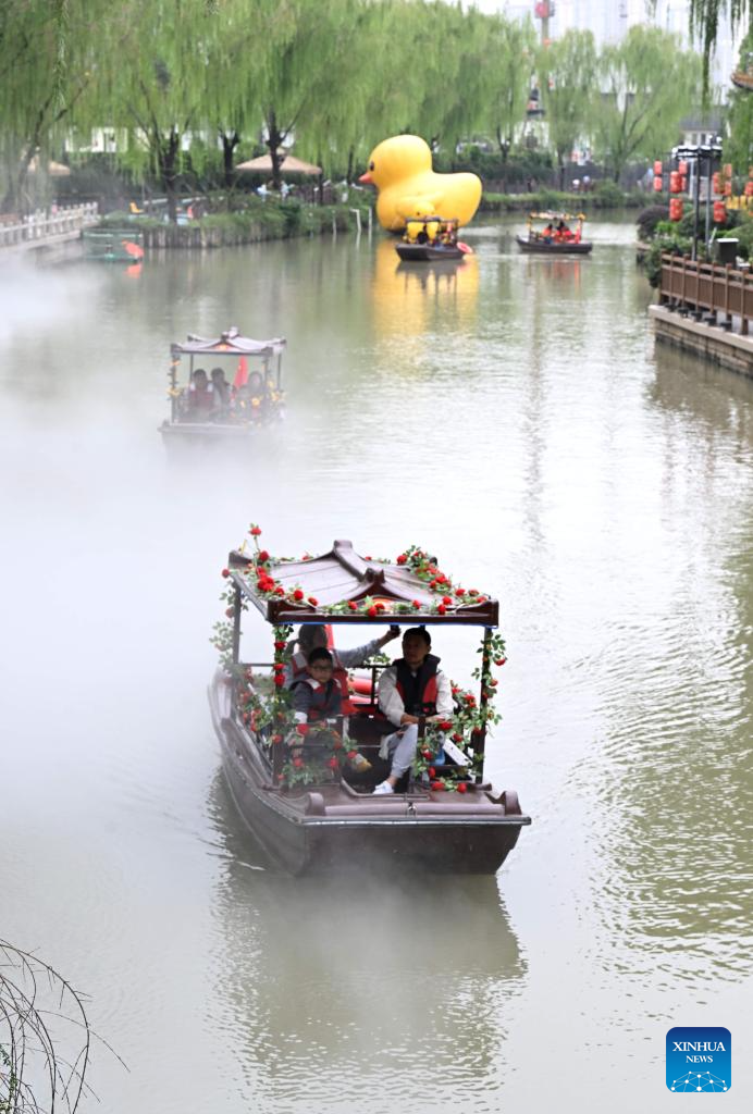People visit Hexia ancient town in Huai'an, east China's Jiangsu Province, Oct. 3, 2025. Tourist destinations across China are witnessing a surge in visitors as the country's eight-day National Day and Mid-Autumn Festival holiday began on Wednesday. (Photo by Chen Qibao/Xinhua)