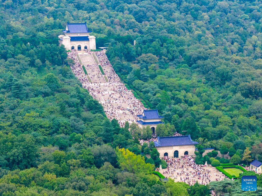 An aerial drone photo taken on Oct. 4, 2025 shows people visiting Sun Yat-sen Mausoleum in Nanjing, capital of east China's Jiangsu Province. Tourist destinations across China are witnessing a surge in visitors as the country's eight-day National Day and Mid-Autumn Festival holiday began on Wednesday. (Photo by Shi Jun/Xinhua)
