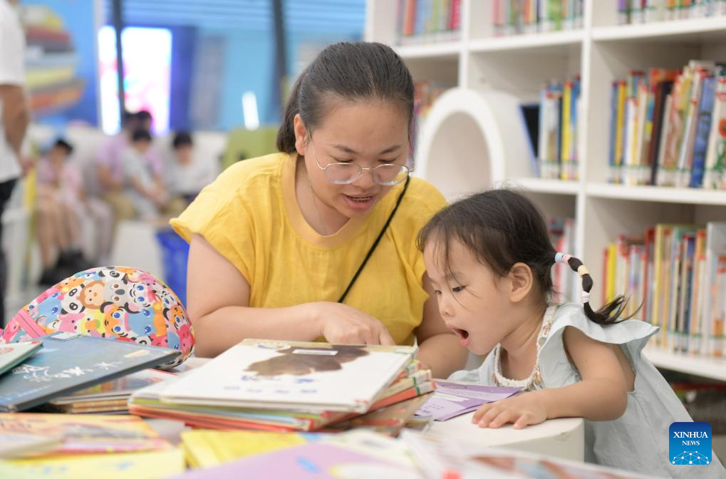 A mother and daughter read at Guangzhou Library in Guangzhou, south China's Guangdong Province, Oct. 4, 2025. Tourist destinations across China are witnessing a surge in visitors as the country's eight-day National Day and Mid-Autumn Festival holiday began on Wednesday. (Xinhua/Lu Hanxin)