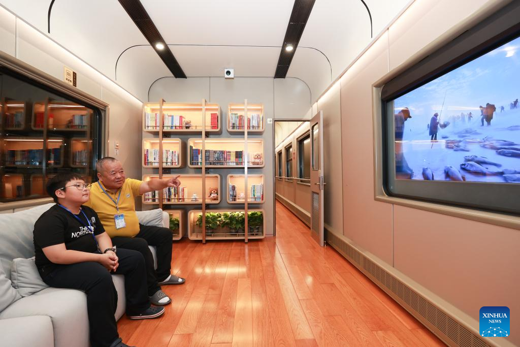 Tourists watch a video on a tourist train for senior citizens at Harbin Railway Station in Harbin, northeast China's Heilongjiang Province, Aug. 22, 2025. A tourist train with elderly-friendly modifications departed from Harbin for a five-day grassland trip on Friday. (Photo by Xu Shuai/Xinhua)